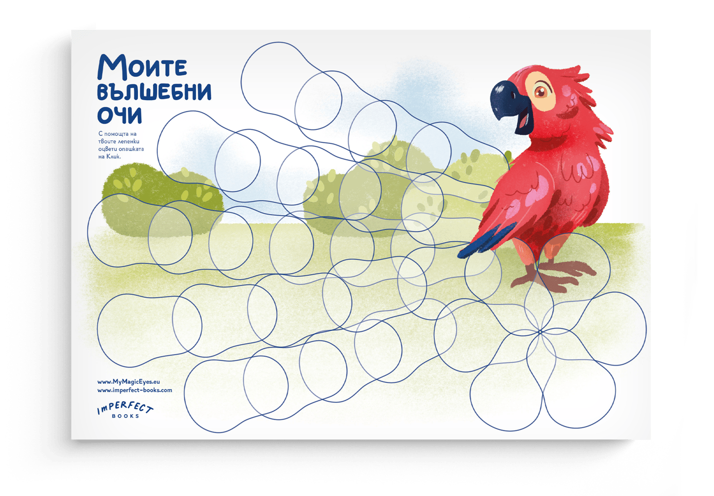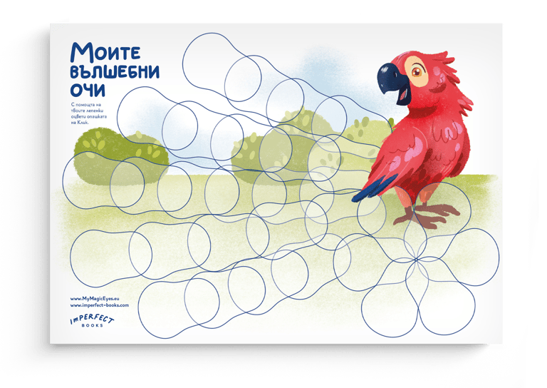 Красив постер за стена, върху който детето лепи своите използвани лепенки за да направи опашката на папагала Клик колкото се може по пъстра. Превръща всеки ден от лечението в малка победа и визуално проследява напредъка.