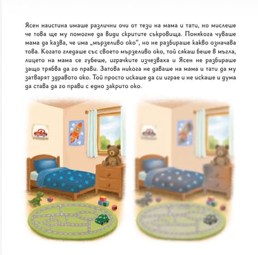 Един от най-трудните етапи в лечението на Мързеливо око е да научим детето да слага лепенка и да прави упражнения с нея. За да помогнем в адаптацията, направихме книжка с упражнения и илюстрации базирани на историята на Ясен и идеи за забавление с мама и татко за първите 30 дена от този процес. Те варират като сложност, идея и възрастови особености. Ще ви помогне да разберете кое работи най-добре за вашето дете, така че да може прекарва времето с лепенка по един забавен за него начин.
